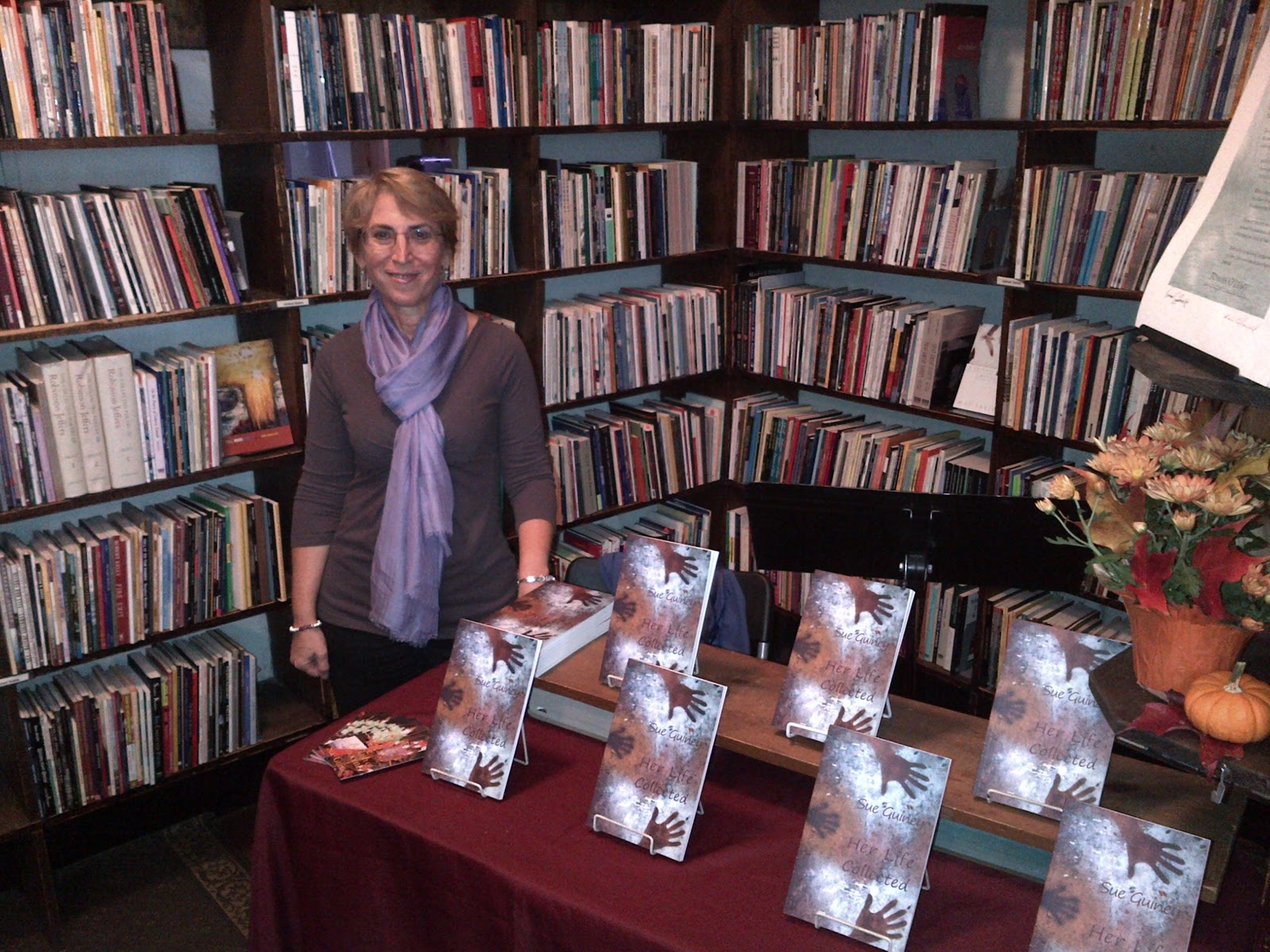 Friday afternoon at The Grolier Poetry Bookshop in Harvard Square. This is a wonderful, old-style bookshop. Shelves full of books. That’s it. No coffee. No computers. No comfy chairs. Just walls full of bookshelves and three people who own and run the place, poets and poetry lovers all. I was set up in a corner by the door, with copies of my poetry book, Her Life Collected, on display and a black music stand. By the cash register was a shelf full of cookies, plastic cups, a jug of cider and a bottle of wine. The idea was that when people happened to come in, I would talk to them and read a poem or two, “as the spirit moved.” A little free form for an A-type compulsive like me. But it was fabulous. There was a lot going on in Harvard Square that afternoon between the University’s 375 Anniversary celebrations, parents weekend and alumni events. And a place like the Grolier doesn’t necessarily get a lot of foot traffic. But over the course of a couple of hours I was able to meet plenty of poetry lovers and read about a dozen poems. Here’s how it worked. Someone would happen to find themselves in the shop, either because they knew about the event or, more likely, because they knew the shop or were intrigued by the window. I then introduced myself to them and chatted. If they were amenable, and most of the time they were, I would ask them a bit about themselves and then choose a poem from the book to read to them, for them. Now really — how often does a real, live poet stand there and read a poem to you, chosen especially for you? Not very often. And what a terrific connection it created with the listener who then, more often than not (I’m happy to say) became a buyer. It’s a great model for a reading, I think. I believe everyone who passed through those doors that afternoon had a positive experience. I met loads of readers/poetry lovers I wouldn’t have met otherwise, I sold lots of books, the bookstore was happy. Thank you, Grolier, for having me. I can’t wait to come back!