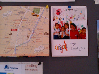 But I have been helped today by the writer, Fiona Robyn. She is one of the more unusual people I have come to know in my life as a writer. Her work, her life, is firmly rooted in her spirituality, and she stands as a constant reminder to me and many others that we all need to stop, listen, slow down and appreciate what we have. To that end, she is today hosting a blogsplash here to celebrate her new novel, The Most Beautiful Thing, which she has decided to give away FOR FREE  as an ebook, for a limited time.  She is a wonderful writer and a generous human being. Why wouldn’t anyone take her up on her offer? I already have, and I urge you to as well. But I know that Fiona would ask you, even before going over to download her book, to take a moment and think about your most beautiful thing of the day. Here’s mine. It’s triggered by the sight of a thank you card to me from my students at Anjali  House, posted on the pegboard above my desk right next to my map of Siem Reap, i.e. images of Cambodia in my personal space in London. My beautiful thing is how I am finding a way to add  Cambodia to my ever expanding concept of home.