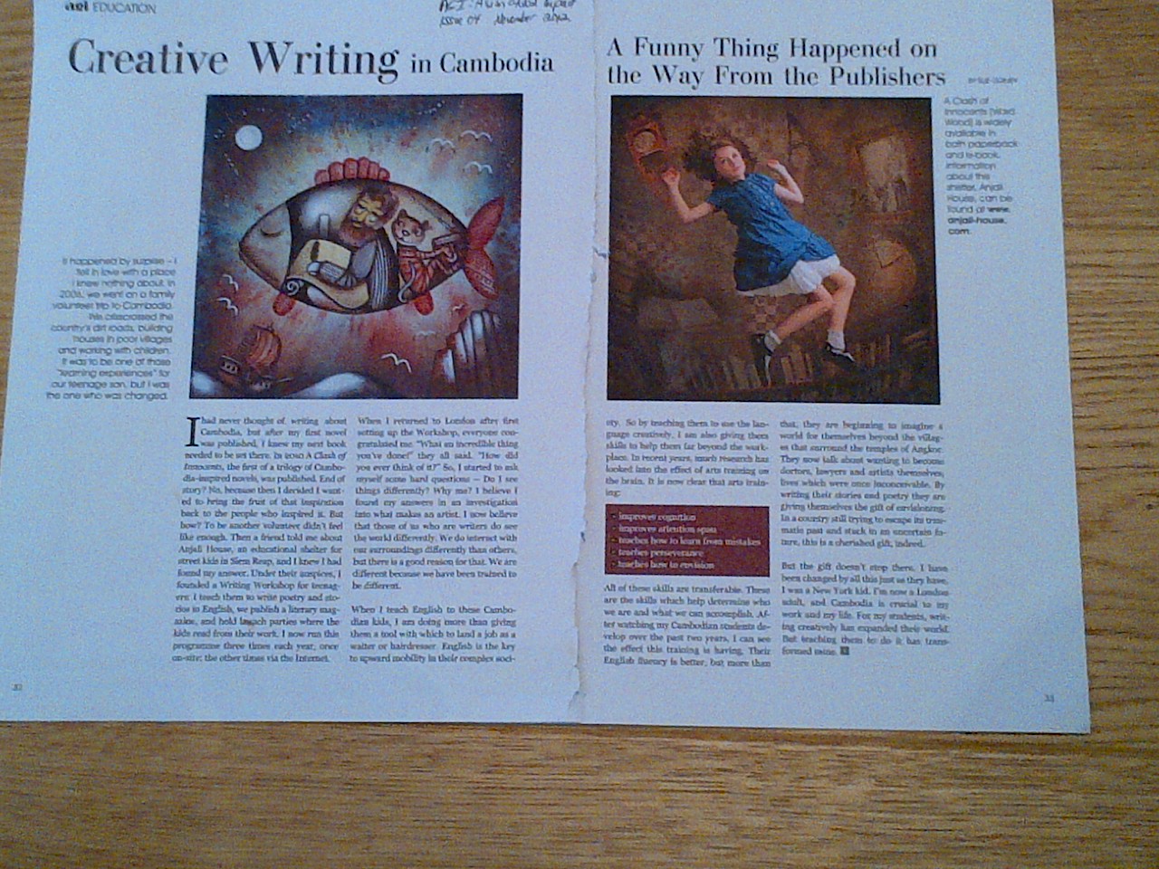 In the previous post here, I wrote about journalistic writing and how I have recently been asked by a few magazines to write articles for them about my work teaching street kids in Cambodia and setting up my writing workshop in the educational shelter, Anjali House. I’m happy to say that the first one recently came out. It is called “Creative Writing in Cambodia” and it is a relatively short piece in the new glossy magazine called AGI: Asian Global Impact. The magazine itself looks great, I think, and is filled with articles and photographs about all things Asian — from business to fashion to sports to well-being to education (which is where my article lands). And it covers issues concerning the entire continent — from the South Asian peninsula to Japan to China to SE Asia (again,where I come in). There is an online version of the magazine which has some of the articles as well as some new ones and a forum. But it doesn’t have my article up there, so here it is: