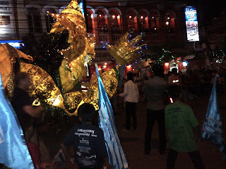Saturday night in Siem Reap…actually, any night in Siem Reap near the Old Market, is a big night. But this past Saturday night was something special. Over the past few years, an annual Giant Puppet Parade has been staged which has now become one of THE events of the Siem Reap calendar. Giant puppets — which I’m told are very easily made, although I don’t believe it — are created by children from various schools and NGO’s, which they then carry in a nighttime parade throughout the streets of Siem Reap. The puppets are lit up, there are floats of musicians and dancers, and the entire town comes out to watch. I’ve heard about this for years, and although this year Anjali House didn’t take part, many of the students came out to watch.
